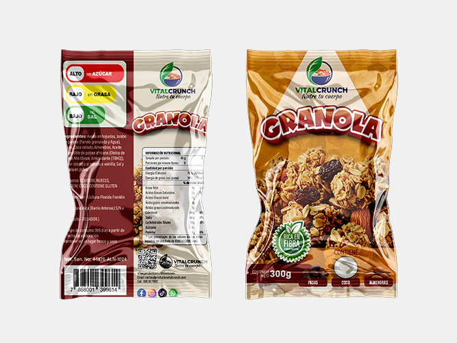 Ingredientes: Avena en hojuelas, Jarabe de panela (Panela granulada y Agua), Pasas, Coco rallado, Almendras, Aceite comestible de palma africana (Oleína de Palma Alto Oleico, Antioxidante (TBHQ)), Sabor idéntico al natural a vainilla, Sal y Canela en polvo.